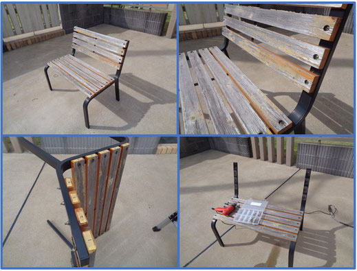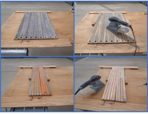取り外した座面と背もたれの表面や側面を電動サンダーを使って塗装や、けば立ちを削って木材の表面を露(あら)わにしていきます。塗装が完全に残っていた裏面側はなかなか塗装が剝げず、削り取りには苦労し、とても時間が掛かりました。この時、板の角が全く面取りがされていない事に気が付きましたので、全ての角の面取りもさせて頂きました。バラシと削りで約3時間半。もっと簡単に行くかと持っていましたが、午前中いっぱい掛かってしまいました。