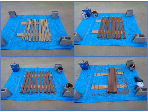ここからようやく塗装開始です! 以前我が家で使った塗料などが残っていて、処分に困っていたものを使います(お客様了承済み)。削りをしていた午前中は、ピーカンで結構厚く、風もそこそこあったので、絶好の塗装日和だと思っていましたが、塗装を始めた午後からは、日差しもなくなり気温も低下、風も落ち着いてしまい塗料の乾きが悪く、なかなか作業が進みません。そんな中でも扇風機など使い下塗り3回、本塗り3回をしっかり塗り上げましたが、最後に塗った座面と背もたれの表面側の本塗りが終わったのが17:30頃になってしまい、全く乾く気配がしないので一晩放置する事にしました。