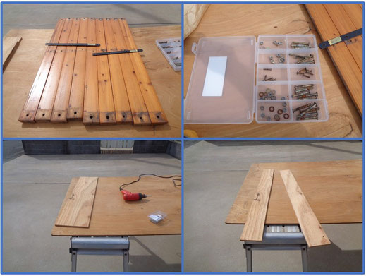 座面と背もたれに付いているプレートも外します。取り外したビスやボルト、ナットやワッシャー類を無くさない様にケースへ保管します、この時にどの場所のボルト類かが分かるように位置を決めて入れていきます。下の写真は削りのガイドに使う板を事前にカットして用意しました。
