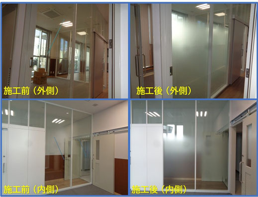 こちらの写真は、通路側になります。正面同様に上下は透明でセンター部にかけて色が濃くなっている事が良く分かります。フィルムを施工する前は目隠しが何もなく、ガラスパーティションの中や室内の窓から外も良く見えますが、施工後は十分に目隠し効果が発揮されています。