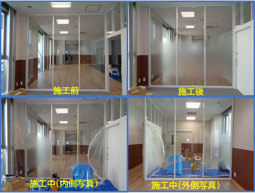 写真は銀行に入って正面に見えるパーティション側の施工前後になります。上下が透明でセンター部にかけて色が濃くなる為、中に誰かいれば一目で分かりますが、着席した人の顔が目隠しできるので、何方が居るかまでは特定できない様なグラデーションになっています。