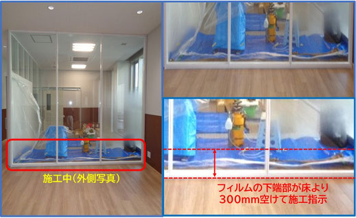 フィルムメーカー様並びに、現場施工指示のもと、フィルムの下端部を床から300mm空けて施工。